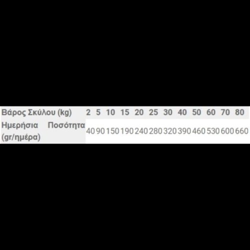 Αναλυτικά συστατικά: ακατέργαστη πρωτεΐνη 26,0%, ακατέργαστο λίπος 12,0%, ακατέργαστες ίνες 5,0%, ακατέργαστη τέφρα 7,5%, υγρασία 10,0%, ωμέγα-3 λιπαρά οξέα 1,0%, ωμέγα-6 λιπαρά οξέα 0,9%, ασβέστιο 1,2%, φώσφορος 0,8%, νάτριο 1,1%, κάλιο 0,5%, μαγνήσιο 0,05%..