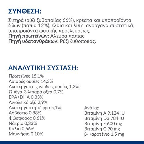 Σολομός & Ρύζι: Αλεσμένο ρύζι, άλευρο σολομού, ζωικό λίπος, υδρολυμένο κοτόπουλο (χαμηλού μοριακού βάρους), φυτικό έλαιο, κυτταρίνη, κιτρικό κάλιο, αλάτι, ιχθυέλαιο, DL-μεθειονίνη, χλωριούχο κάλιο, υδροχλωρική L-λυσίνη, L-θρυπτοφάνη, ταυρίνη, βιταμίνες και ιχνοστοιχεία. Περιέχει αντιοξειδωτικές ουσίες εγκεκριμένες από την EΕ.