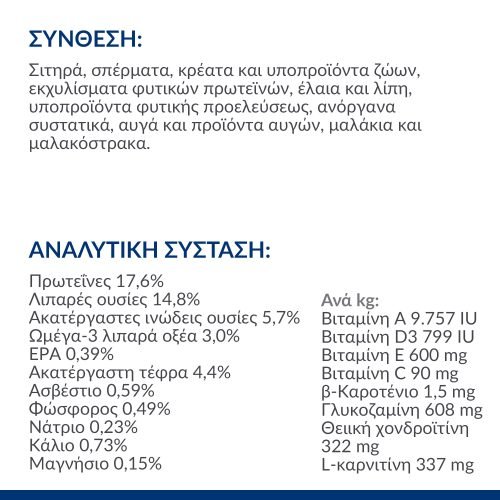 – Βοηθά στη διατήρηση των χόνδρων των αρθρώσεων χάρη στα υψηλά επίπεδα του ΕΡΑ (του ειδικού ω-3 λιπαρού οξέος από ιχθυέλαιο) και χάρη στη γλυκοζαμίνη και θειική χονδροϊτίνη από φυσικές πηγές.