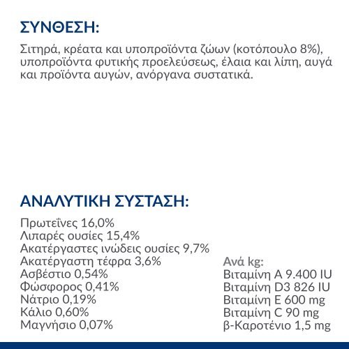 Αλεσμένο καλαμπόκι, αλεσμένο ρύζι, άλευρο κοτόπουλου και γαλοπούλας, κονιοποιημένη κυτταρίνη, ζωικό λίπος, άλευρο φλοιού μπιζελιών, υδρολυμένες πρωτεΐνες, αφυδατωμένο πλήρες αυγό, φυτικό έλαιο, κιτρικό κάλιο, θειικό ασβέστιο, αλάτι, ανθρακικό ασβέστιο, ταυρίνη, L-θρυπτοφάνη, βιταμίνες και ιχνοστοιχεία. Περιέχει αντιοξειδωτικές ουσίες εγκεκριμένες από την EΕ.