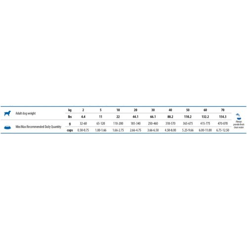 Ακατέργαστη πρωτεΐνη 18.00%, Ακατέργαστες λιπαρές ουσίες 7.00%, Ακατέργαστες ινώδεις ουσίες 1.20%, Ακατέργαστη τέφρα 5.30%, Ασβέστιο 0.70%, Φώσφορος 0.50%, Νάτριο 0.25%, Κάλιο 0.70%, Μαγνήσιο 0.110%, Ωμέγα-3 λιπαρά οξέα 1.10%, Ωμέγα-6 λιπαρά οξέα 1.50%, ΕΡΑ 0.25%, DHA 0.35%.